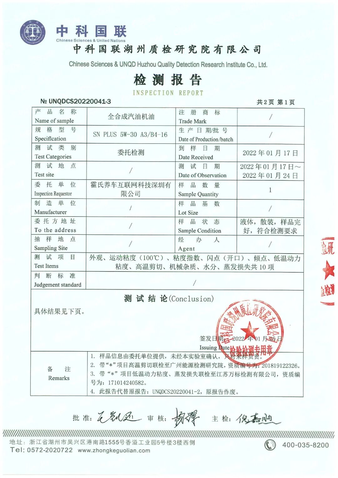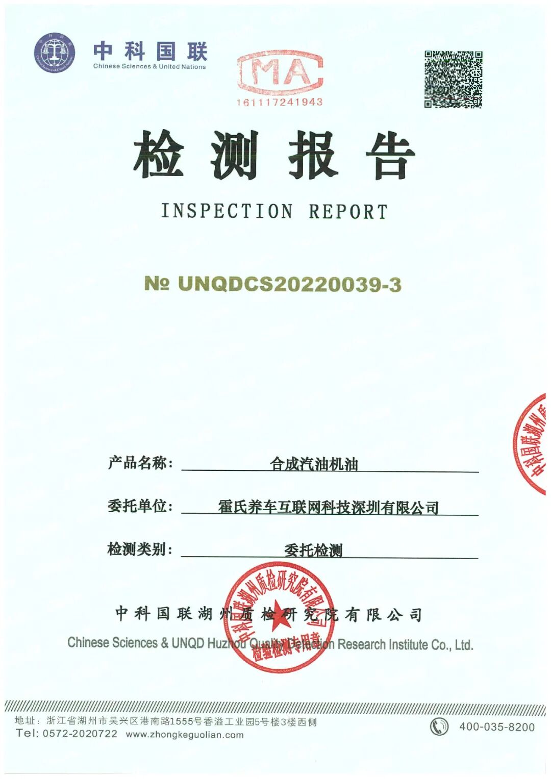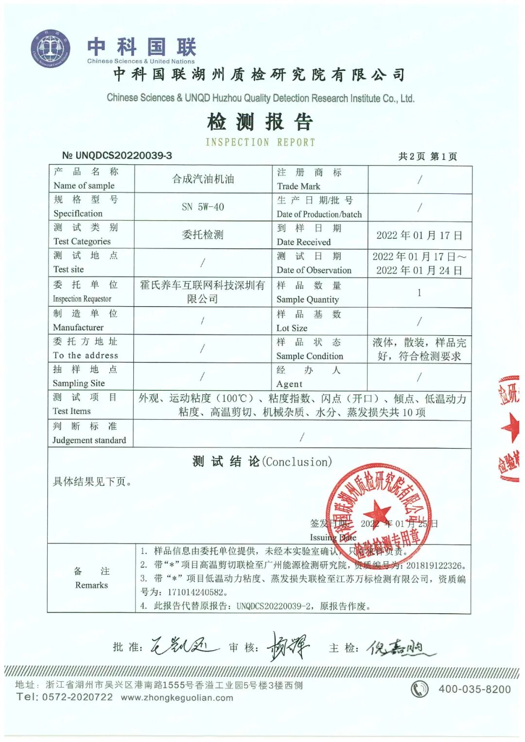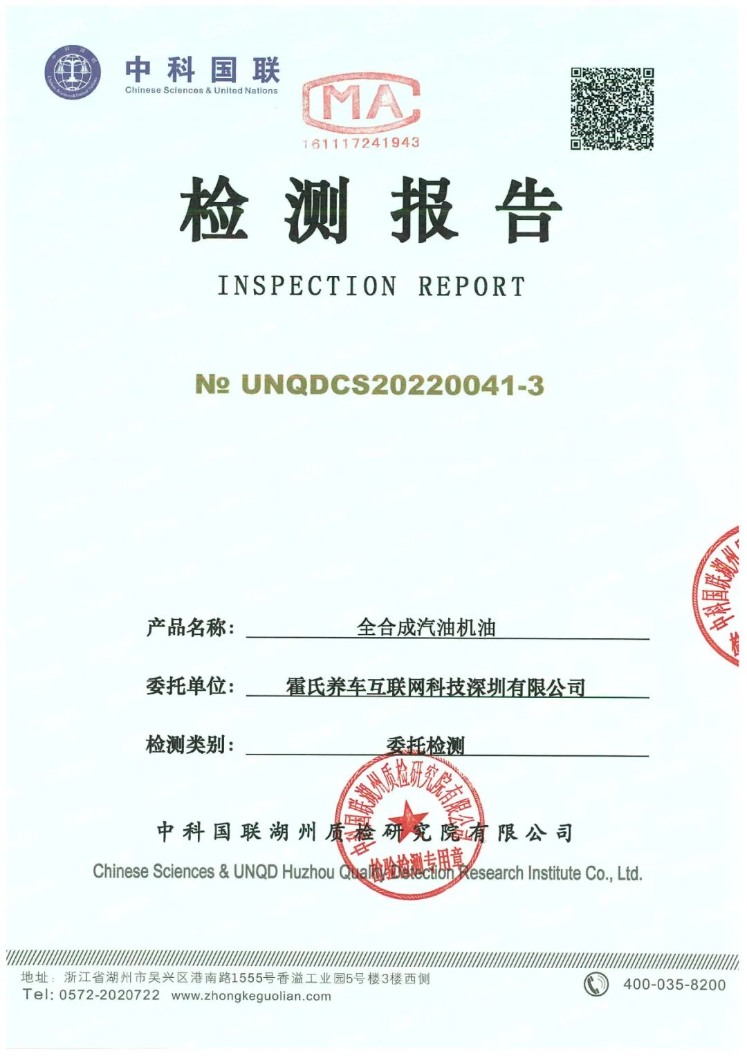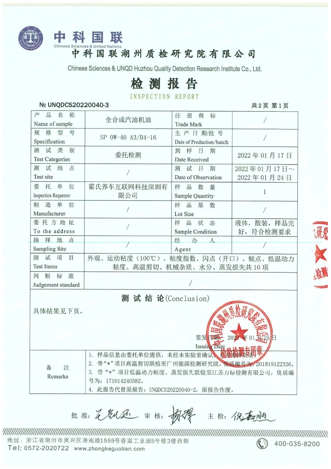 为了让消费者更好地了解霍氏润滑油品质,公司委托第三方检测机构中科国联湖州质检研究院有限公司(以下简称:中科国联)对霍氏汽机油系列产品进行抽检。